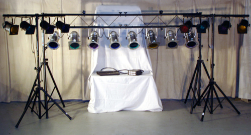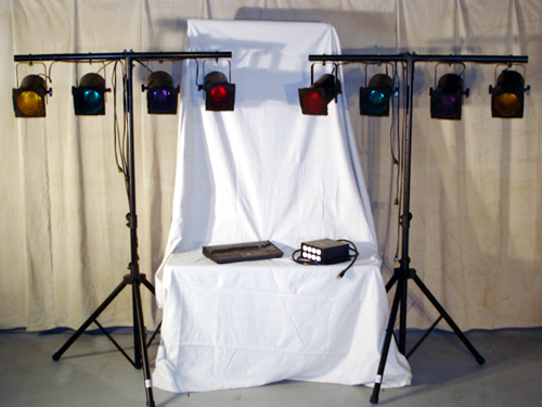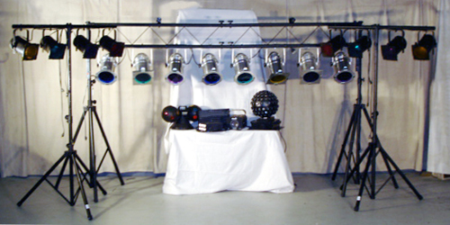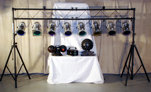 | $400 | The Full Monty (Best Value)-  2 -  4 Par 38 Light Trees,  Static 8 Par 56  Light Truss, Control Board, Dimmer, 3 Motion Lights, 2 Strobes |